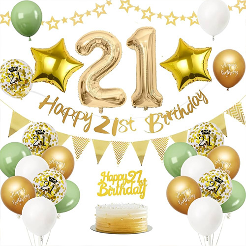 21ú sraith balún: Tá an 21ú sraith balún seo comhdhéanta de balúin laitéis, balúin scragall, bratacha lá breithe agus gabhálais eile. Tá sé éasca le chéile agus féadann sé do chóisir lá breithe 21ú níos searmanais a dhéanamh. Cabhróidh a leithéid de shuíomh ardchaighdeáin agus iontach seo leat oíche do 21ú breithlá a mhaisiú agus déanfaidh sé seo nóiméad luachmhar nach ndéanfaidh d’iníon, tú féin ná an teaghlach ar fad dearmad go deo uirthi.