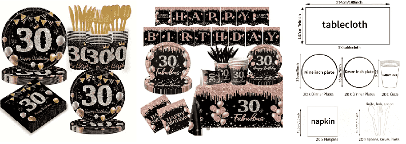 Tá cárta lá breithe páipéir mar chroílár maisiú císte: tá an príomhchárta bunaithe ar fhocail mar "30ú Breithlá Shona" agus déantar é a mheaitseáil le cruth cupán Champagne. Tá an méid mór agus oiriúnach chun an príomh-chíste a mhaisiú. Tá lógó ciorclach "30" ann freisin, réaltaí, coróin agus cártaí beaga eile, atá oiriúnach le haghaidh cupcakes, déanta as cairtchlár crua tiubhaithe, le bataí bambú ag an mbun, is féidir a chur isteach le húsáid.