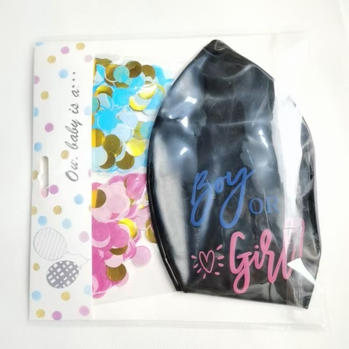 Chun anBalún nochtann inscne 36 orlachi stoc, tá dath dubh Neamhlonrach agus tá go leor stíleanna priontála, cosúil le buachaill nó cailín, pictiúr carachtar buachaill agus cailín nó rud éigin eile a bhaineann le buachaill agus cailín. Maidir leis an confetti, is é mála amháin confetti páipéar bándearg le confetti dath óir scragall, mála eile confetti páipéar gorm le scragall confetti dath óir.