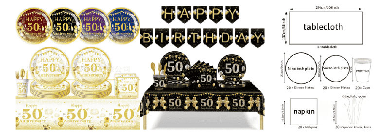 Barraí lá breithe páipéir: mar chroí-mhír maisiúcháin císte, glacann an príomhchárta na focail "lá breithe sona go 50 bliain d'aois" mar chroílár, agus meaitseálann sé an príomh-mhaisiú císte le tinte ealaíne, réaltaí, hata lá breithe agus cruthanna eile. Ag tacú le babhta "50", is féidir scamaill auspicious, coróin agus cártaí mion eile, déanta as cairtchlár tiubhaithe agus a mheaitseáil le bataí bambú soladach, a mhaisiú le cupcakes agus táblaí milseog, le sonraí fíorálainn.