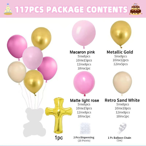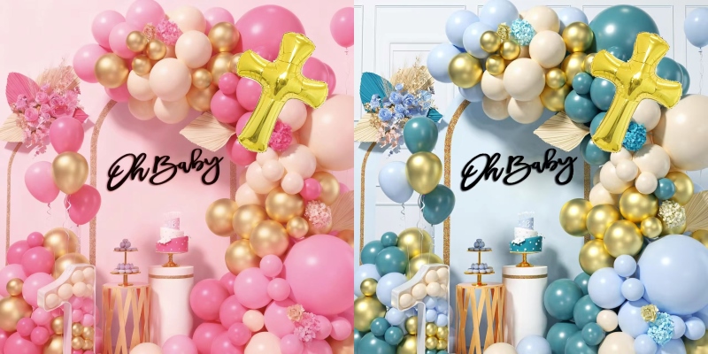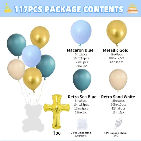 Tá dhá stíl ag na feisteáin áirse balún cithfholcadh leanbh, tá stíl amháin do chailíní leanbh agus tá stíl amháin do bhuachaillí leanbh. Tá an sraith cailín leanbh déanta as balún dath bándearg macaróin, balún dath ardaigh éadrom Neamhlonrach, balún dath craiceann éadrom Neamhlonrach, balún dath óir miotalach agus cros ór bless. Tá an sraith buachaill leanbh déanta as balún dath gorm macaróin, balún dath gorm farraige retro, balún dath craiceann éadrom Neamhlonrach, balún dath óir miotalach agus cros ór beannaigh. Tá an ponc gliú agus an turas balún ag an mbeirt acu, is féidir leat iad a úsáid chun garland iomlán deas a dhéanamh.