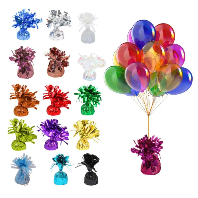 Faoi láthair cuirimid dathanna éagsúla ar fáil chun dathanna agus sraith éagsúla balún a mheaitseáil. Is rogha coitianta i measc na gcustaiméirí iad na meáchain balúin miotalacha is nuaí, mar is iad na cinn is coitianta. Is éard atá i gceist le meáchain balún trom agus faiseanta ná bonn gaineamh láidir agus bonn stroighne agus tá siad fillte i scragall alúmanaim daite maisiúil, ag cur elegance le do mhaisiúcháin. Is furasta meáchain balúin sturdy a dhaingniú go héasca, ag cinntiú go bhfanann do mhaisiúcháin i bhfeidhm le linn na hócáide, ag cur spréach agus charm gan teorainn le do pháirtí.