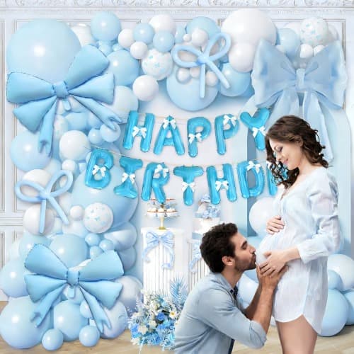 Áirítear ar an tacar seo balún dath gorm macaroon i 5inch, 10inch, 12inch agus 18inch, dath bán Neamhlonrach i 5inch, 10inch, bratach lá breithe sona, scragall macaroon balún bogha gorm, macaroon gorm 260 balún fada, bogha ribín, ponc gliú agus stiall maisiú balún.