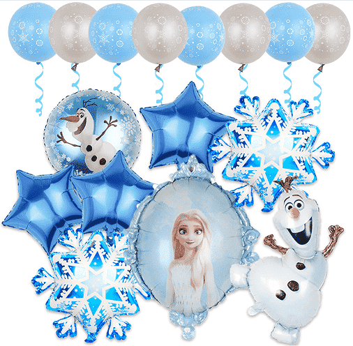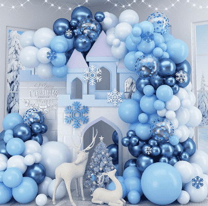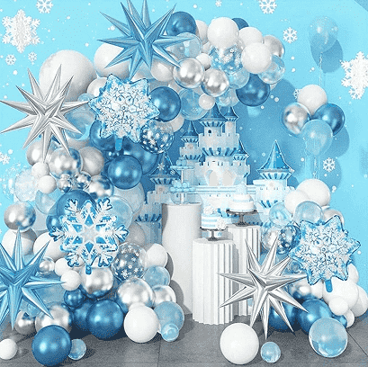 3.Feisteáin garland balún reoitede ghnáth go bhfuil méideanna éagsúla debalúin reoite, balúin scragall uathúla, meaitseáil ribíní maisiúil, inflaters, spotaí gliú gan mharcáil, ceangail suiteála agus gabhálais eile chun freastal ar riachtanais leagan amach in aon stad. Tá na comhpháirteanna go léir déanta as ábhair atá sábháilte agus atá neamhdhíobhálach don chomhshaol, atá oiriúnaithe go hiomlán do radhairc ghníomhaíochta leanaí. Déantar an patrún balún san oireann a mheaitseáil go cúramach, ag comhcheangal íomhá carachtar clasaiceach Frozen leis na heilimintí oighir agus sneachta aislingeach. Tá na dathanna gorm, bán agus airgead, rud a chruthaíonn atmaisféar draíochta íon agus rómánsúil.