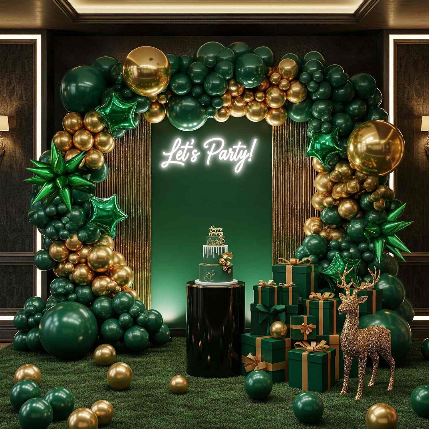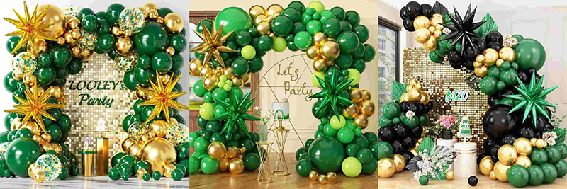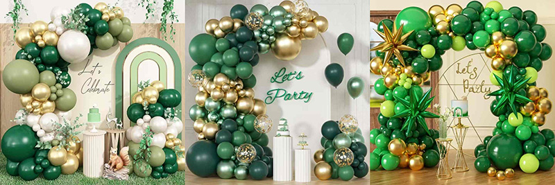 Nuair a mheascann balúin glas Neamhlonrach, glas dorcha agus glas eile le hór, mothaíonn na dathanna éagsúla glasa cosúil le saol foraoise agus elegance sean-aimseartha a gabhadh sa áirse. Shines óir cosúil le solas na gréine, rud a fhágann go bhfuil an dath iomlán níos gile. Coinníonn an glas athraitheach an áirse bríomhar, agus bogann an t-ór miotalach an troime glas. Mothaíonn an toradh nádúrtha, saibhir, agus mhaisiúil, ag feistiú go leor radhairc páirtí retro.