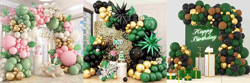 Is féidir leat balúin daite bán bán nó piorra a úsáid le áirse balún glas agus ór. Beidh sé bog agus te agus cosúil le húire gairdín earraigh a ghabháil; nuair a bhíonn sé péireáilte le balúin daite bándearg, féadann sé mothú bríomhar milis a chruthú gan a bheith ag cloying, ag insileadh atmaisféar rómánsúil i cithfholcadáin leanbh agus páirtithe ar théamaí cailíní; fiú nuair a chomhcheanglaítear iad le dathanna níos doimhne cosúil le dubh agus donn, is féidir le dathanna glasa agus óir cothromaíocht a dhéanamh idir doimhneacht agus cobhsaíocht na dathanna sin lena teannas datha buailte, ag cruthú ambiance ceiliúrtha nua-aimseartha ach te.