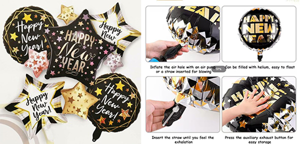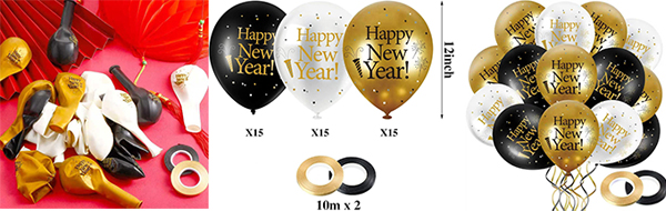Is cuid riachtanach de mhaisiúchán saoire iad balúin ar théama na Bliana Nua. Cruthaíonn na balúin bríomhar seo, i dubh agus ór, teagmháil fhéile uathúil, rud a thugann áthas agus stíl d'atmaisféar na Bliana Nua. Cuireann a n-uigeacht bhuan in aghaidh an díbhoilscithe, rud a ligeann dóibh fanacht lán ar feadh tréimhsí fada. Is féidir iad a theannadh lehéiliam nó aer, cuma iomlán, tríthoiseach a chothabháil. Tá siad foirfe le haghaidh maisiú laistigh agus lasmuigh.