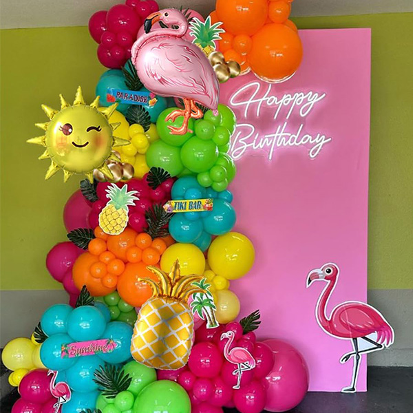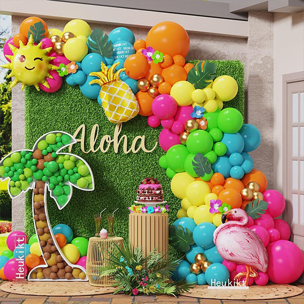 Is féidir linn é a shaincheapadh de réir do théama féin, ag roghnú do phailéad dathanna uathúil féin. Mar shampla, trí roinnt balúin retro-téamaí a chur leis cruthófar atmaisféar trópaiceach agus Fhéile do d'ionad, ag cur glamour le do Kit Garland Balún Haváís.