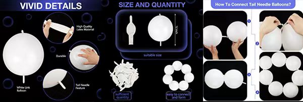 Úsáidtear na balúin eireaball laitéis seo go forleathan chun slabhraí balúin, líonta balúin, cúlra balúin, agus áirsí balúin a chruthú, rud a fhágann go bhfuil siad ina mbreiseán foirfe do pháirtithe céime, comóradh, agus ceiliúradh eile. Tá balúin eireaball faisin solúbtha agus sábháilte, oiriúnach don chuid is mó daoine. Seasann ár mbalúin nasc tapaidh lena ndearadh uathúil ó cheann go ceann, ag fáil réidh leis an ngá le huirlisí. I gcomparáid le balúin thraidisiúnta, tá an próiseas balún naisc níos simplí agus níos tapúla, rud a ligeann duit d'ionad páirtí nó imeachtaí a mhaisiú ar bhealach níos éifeachtaí.