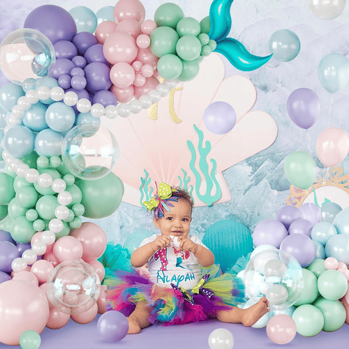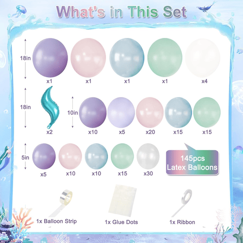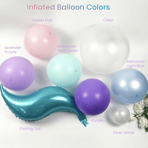 Tagann na balúin i Garland balún Mermaid le dathanna il, mar shampla corcra, lavender, bándearg pastel, gorm éadrom, teal green, pearl white agus trédhearcach, chomh maith le maisiúcháin eireaball mermaid scragall, rud a fhágann go bhfuil sé iontach chun páirtí téama farraige mermaid draíochta a chruthú.