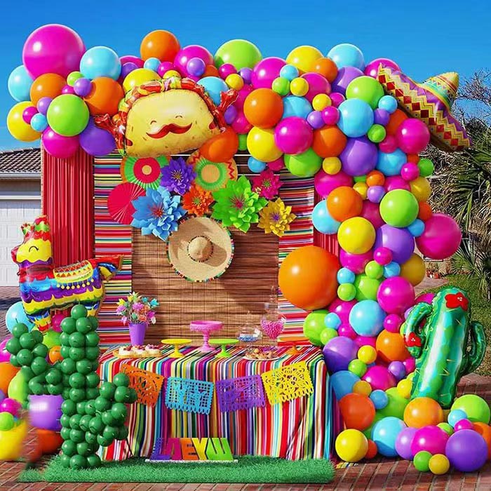 Tairgeann an trealamh balún balún is nua -Mheicsiceo an t -áirse datha éagsúla. Mar shampla, tá cúlra lá breithe sona, scaraoid stríocach, agus burrito-, sombrero-, agus balúin alúmanaim alúmanaim i gclós stríocach, agus burrito-, sombrero-, agus balúin scragall alúmanaim. Tairgeann Borun Store freisin áirsí garland balún fiesta chun freastal ar do riachtanais shonracha. Is féidir leat dathanna sonracha balúin a roghnú agus stíleanna éagsúla liathróid scragall alúmanaim le chéile agus a mheaitseáil le haghaidh ócáidí éagsúla.