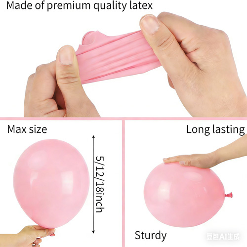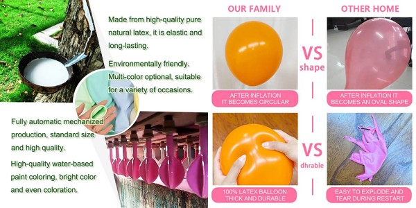 Amhábhair balún: Déanta as laitéis nádúrtha íon a allmhairítear ó Oirdheisceart na hÁise. Tá balúin níos solúbtha, is féidir iad a shéideadh go méideanna níos mó, is lú an seans go bpléascfaidh siad, agus is féidir iad a dhíghrádú go hiomlán go nádúrtha gan aon truailliú a dhéanamh don chomhshaol.