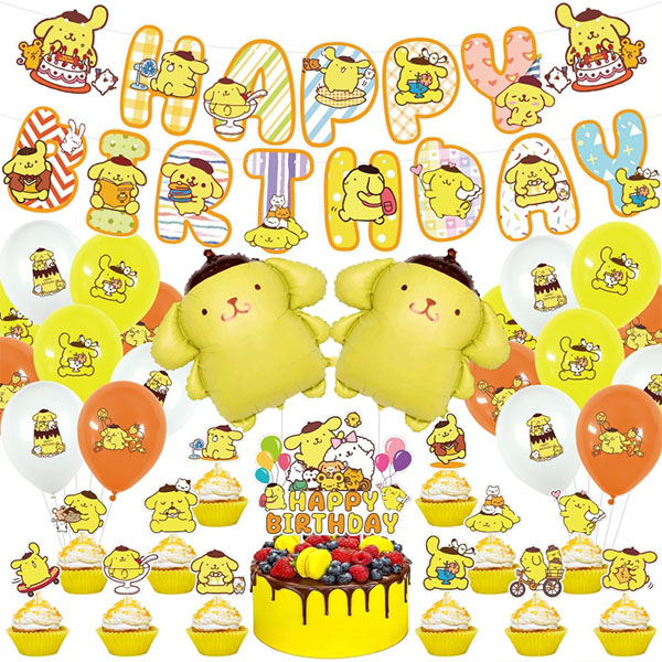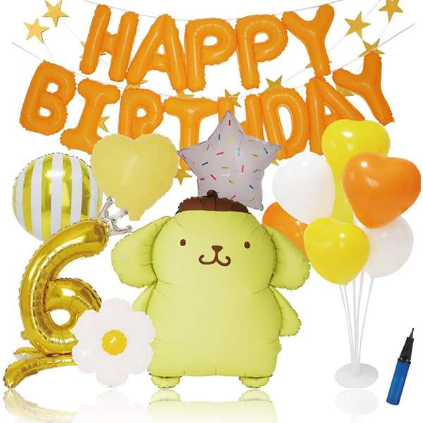 Ba é an PomPomPurin an t-aisghabhálaí órga ar Kanagawa, an mála maireachtála, ar dtús. D'ainmnigh an stiúrthóir é mar mhadra maróg mar gheall ar an gcuma álainn a bhí air a bheith clúdaithe le plúr agus é santach le haghaidh maróg. Tar éis dó dul isteach i dteaghlach Sanrio, ghnóthaigh a charachtar íocónach beret agus leisciúil go tapatóir agus bhí grá ag leanaí ar fud an domhain. Tá balún scragall PomPomPurin tríthoiseach sa trealamh balún scragall PomPomPurin seo, balúin scragall clóite PomPomPurin agus balúin scragall croí-chruthach nó balúin scragall réalta. Tá an balún scragall a tháirgtear ag Monarcha Balún NiuN® déanta as ábhar scragall ardchaighdeáin, atá durable agus ath-inúsáidte, nach bhfuil sé éasca a bhriseadh, agus atá oiriúnach le haghaidh maisiú laistigh agus lasmuigh. Trí úsáid a bhaint as an trealamh seo ag cóisir do leanaí, beidh an cóisir níos suimiúla agus cuirfidh sé áthas ar aíonna agus ar leanaí.