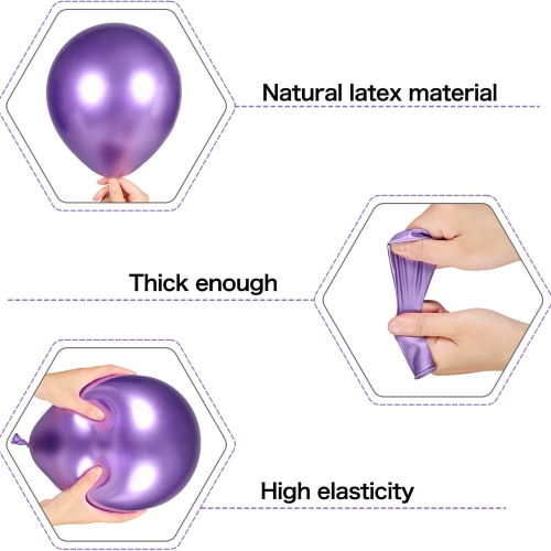 Tá ár balúin corcra agus dubh déanta as laitéis nádúrtha. Nuair a bheidh na balúin teannta, bíonn cruth iomlán, plump orthu agus níl siad éasca le pléasctha. Gné siad dathanna geala agus beoga. Tá ár balúin tar éis tástálacha a rith mar EN71, CPC, agus CE. Tá siad sábháilte agus neamh-tocsaineach, rud a fhágann go bhfuil siad oiriúnach do leanaí a bheith ag súgradh leo. Is féidir iad a dhíol i dtíortha éagsúla.